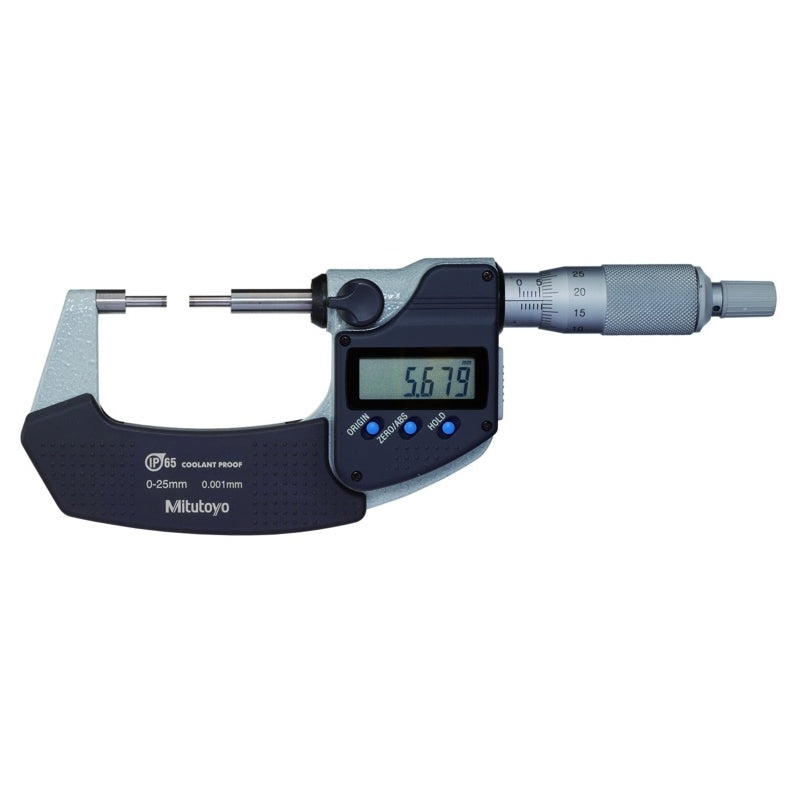 Mitutoyo – Digitalmikrometer mit feinen Spitzen Ø2, Schutzart IP65.