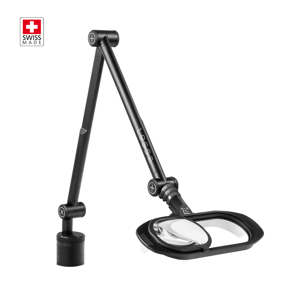 Der Lampenkopf erzeugt keine Wärme und bietet dem Benutzer so höchsten Komfort. Dieser Komfort wird durch die drei Scharniere (das Hauptscharnier ist für über 100.000 Zyklen zertifiziert) zusätzlich erhöht, die eine besonders einfache und präzise Positionierung der Lampe ermöglichen. Um den Bedürfnissen der PRISMA-Anwender vollumfänglich gerecht zu werden, wurde die Lampe modular aufgebaut und verfügt über eine optionale Lupe (mit Antireflexbeschichtung). Dank der Standardfassung ist sie an den meisten Arbeitsplätzen einsetzbar. Mit dem mitgelieferten Fuß kann sie zudem in jeder Art von Arbeitsbereich verwendet werden.