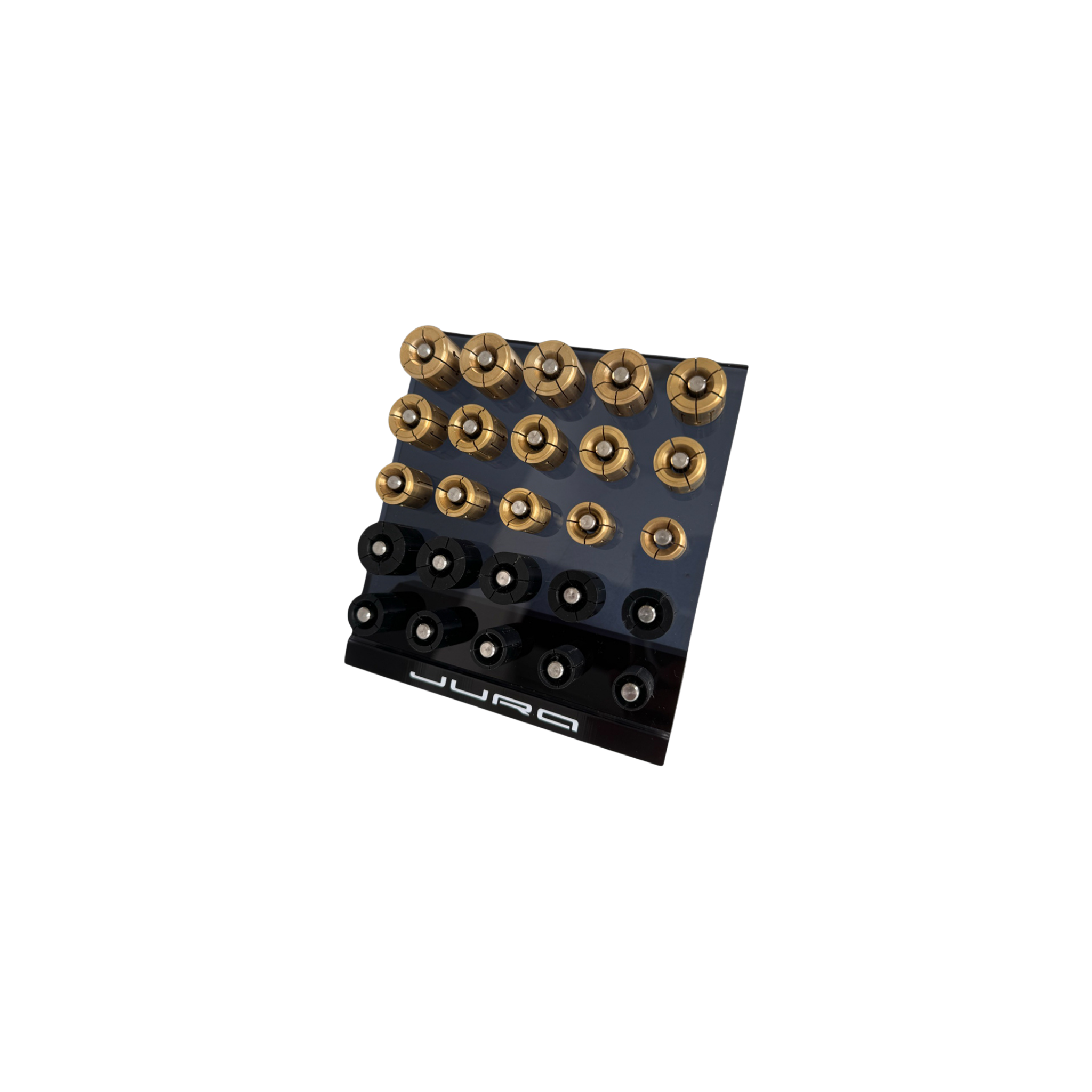 Collet Set with 15 brass collets and 10 plastic collets, ideal for use with QC ring clamps and 3X Line. The brass collets are designed to withstand hammering. The set includes a matching organizer for collet storage.