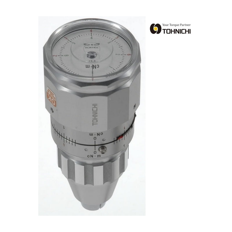 The ATGCN-S is a portable TOHNICHI torque tester for low torques (0.1–24 cN·m) with bidirectional reading. Its keyless 3-jaw aluminum chuck and overload stop ensure secure clamping. Supplied in a plastic case with calibration certificate, it features retention pointers on upper and side scales for easy viewing.