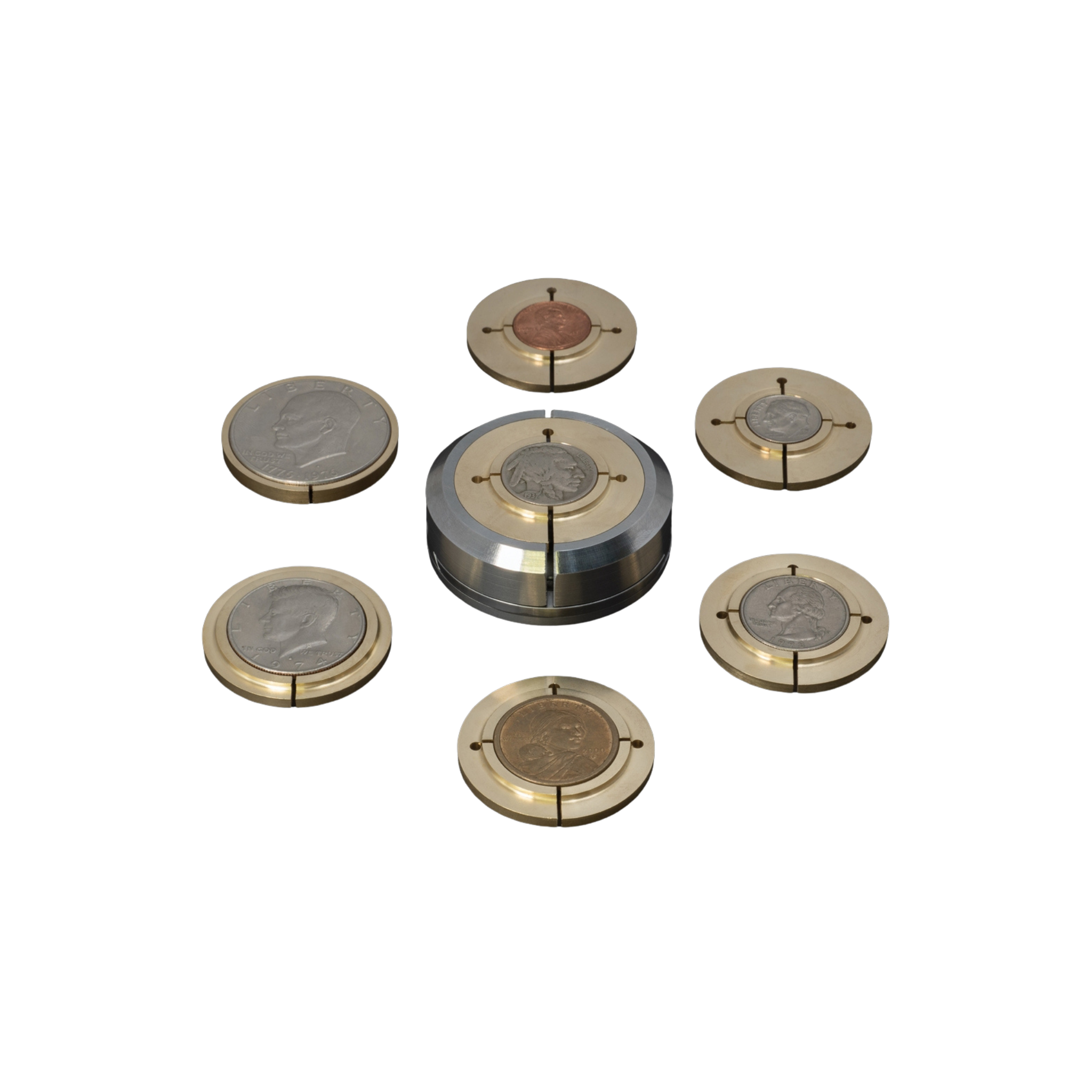 Le support est livré avec des collets correspondant aux tailles suivantes de pièces : Penny, Dime, Nickel, Quarter, Dollar, Half Dollar et Eisenhower Dollar (pièces non incluses).